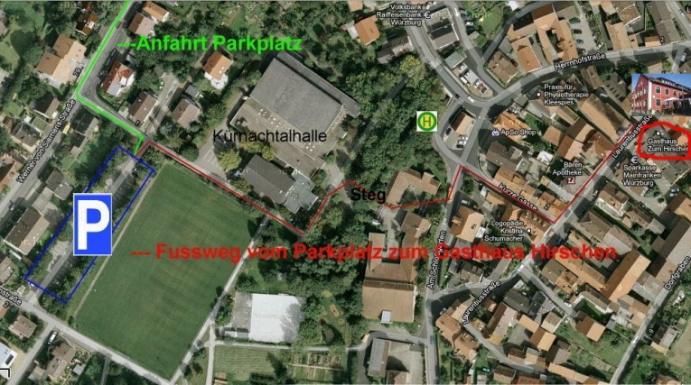 Für alle, die mit dem Auto kommen: Das Gasthaus "Zum Hirschen" liegt im nordöstlichen Würzburger Stadtteil Lengfeld - ist erreichbar über die B19 Würzburg - Schweinfurt, Abfahrt Würzburg - Lengfeld (1. Abfahrt nach der Stadtgrenze) - unmittelbar nach der Abfahrt links abbiegen (Sonnfeld / Alte Würzburger Str.) - geradeaus bergab bis zum nächsten Vorfahrt - Achten - Schild fahren - rechts in die Werner-von-Siemens-Strasse abbiegen - nach ca. 30m links zum Sportzentrum Kürnachtal / Kürnachtalhalle (weißes Hinweisschild) abbiegen, dann gleich wieder rechts auf die Parkplätze. Achtung: Bitte unbedingt den öffentlichen Parkplatz neben der Längsseite des Fussballfeldes benutzen und nicht die Parkplätze, die zur Gaststätte Kürnachtalhalle gehören! Aus Richtung Aschaffenburg oder Nürnberg: A3 Richtung Würzburg bis Abfahrt Würzburg-Heidingsfeld, dann B19 Richtung Schweinfurt Aus Richtung Lohr/Karlstadt: B27 Richtung Würzburg, am Ortsschild Würzburg links halten und über die Nordtangente zur B19 Richtung Schweinfurt Aus Richtung Creglingen: B19 Richtung Würzburg/Schweinfurt Aus Richtung Uffenheim: B13 Richtung Würzburg, nach dem Ortsschild Würzburg nach rechts auf die B19 Richtung Schweinfurt abbiegen Aus Richtung Kitzingen: B8 Richtung Würzburg bis Ausfahrt Würzburg - Lengfeld, an der Ampel nach der Ausfahrt nach links in die Nürnberger Strasse abbiegen, an der nächsten Ampel bei der RAN-Tankstelle nach rechts in die Werner-von-Siemensstraße fahren. Der Strasse bis zur Ampel am Lidl folgen, dann rechts abbiegen und bei der Nr. 90 auf den Parkplatz fahren Aus Richtung Schweinfurt/Bad Neustadt: A7 Richtung Würzburg bis Ausfahrt Würzburg-Estenfeld, dann B19 Richtung Würzburg bis zur Abfahrt Würzburg-Lengfeld (eine Abfahrt vor der Stadtgrenze) Parkplätze sind in ausreichender Menge am Sportzentrum Kürnachtal, Werner-von-Siemens-Straße 90, vorhanden. Vom Parkplatz sind es dann noch 5 Minuten zu Fuss bis zum Gasthaus Hirschen (Fussweg siehe folgende Karte). Am Spieltag werden wir den Fussweg ausschildern. |