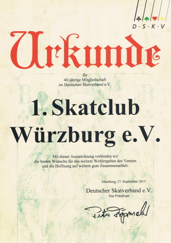 1. Mai 1975: Würzburger Skatclub gegründet Sechs skatbegeisterte Würzburger gründeten am 1. Mai 1975 den Ersten Skatclub Würzburg, nämlich die Herren Wolfgang Dopel, Rolf Gerberich, Siggi Kohn, Walter Lutkoviak, Wolfgang Rieth und Fritz Schmitt. Zum ersten Vorstand wurde Wolfgang Rieth gewählt, der dieses Amt 2 Jahre bekleidete, bis 1977 Sepp Ulsamer auf den Regiestuhl wechselte und zwei Jahrzehnte lang die Geschicke des Vereins lenkte. Unter seiner Führung wuchs der Verein schnell auf über 30 aktive Mitglieder an und hatte einige starke Spieler in seinen Reihen, die auch bei den Verbandsmeisterschaften vorne mitmischten. Siggi Kohn spielt als einziges Gründungsmitglied noch heute im Verein . Er ist als ältester Spieler des Vereins das beste Beispiel dafür, dass Skat jung und geistig fit erhält. |