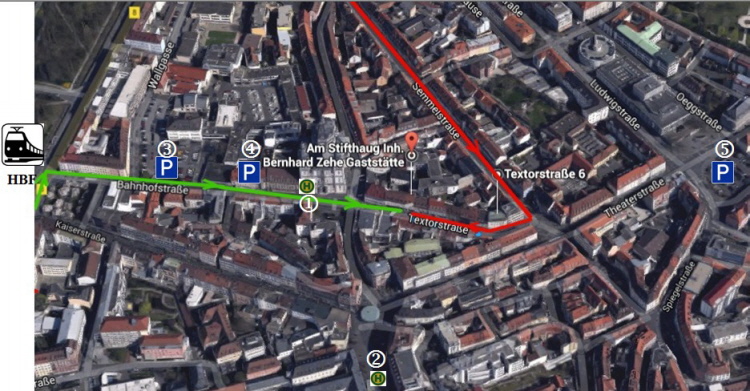 ![]() Sie fahren von der Friedensbrücke kommend auf der B8 über den Röntgenring und biegen auf Höhe des Hauptbahnhofs nach rechts in die Bahnhofstraße ab.Die Gaststätte Stift Haug befindet sich nach der nächsten Kreuzung auf der linken Seite. Vom Berliner Ring kommend nehmen Sie im Kreisverkehr die Ausfahrt in die Kroatengasse, fahren geradeaus die Semmelstraße bis zum Ende und biegen nach rechts in die Textorstraße ab. Die Gaststätte Stift Haug befindet sich vor der nächsten Kreuzung auf der rechten Seite. Das Bild links zeigt die Gaststätte bei Anfahrt über die Bahnhofstraße. Parkmöglichkeiten sind ab 19 Uhr kostenlos in der näherenUmgebung entlang der Semmelstraße, Textorstraße, Bahnhofstraße, Heinestraße und am Theater vorhanden. Außerdem stehen in der Bahnhofstraße der WVV-Parkplatz (bis 20h 1,50 €/Std., ab 20h 50 ct /2 Std., Entfernung 2 Gehminuten) und das Parkhaus Seinsheimgarage ( durchgehend 1 € /Std.) zur Verfügung. Bild unten links: Zufahrt zum WVV-Parkplatz Bild unten rechts: Einfahrt der Seinsheim-Parkgarage mit Matthias-Ehrenfried-Haus, Stift-Haug-Kirche und Gaststätte im Hintergrund. ![]() ![]() |